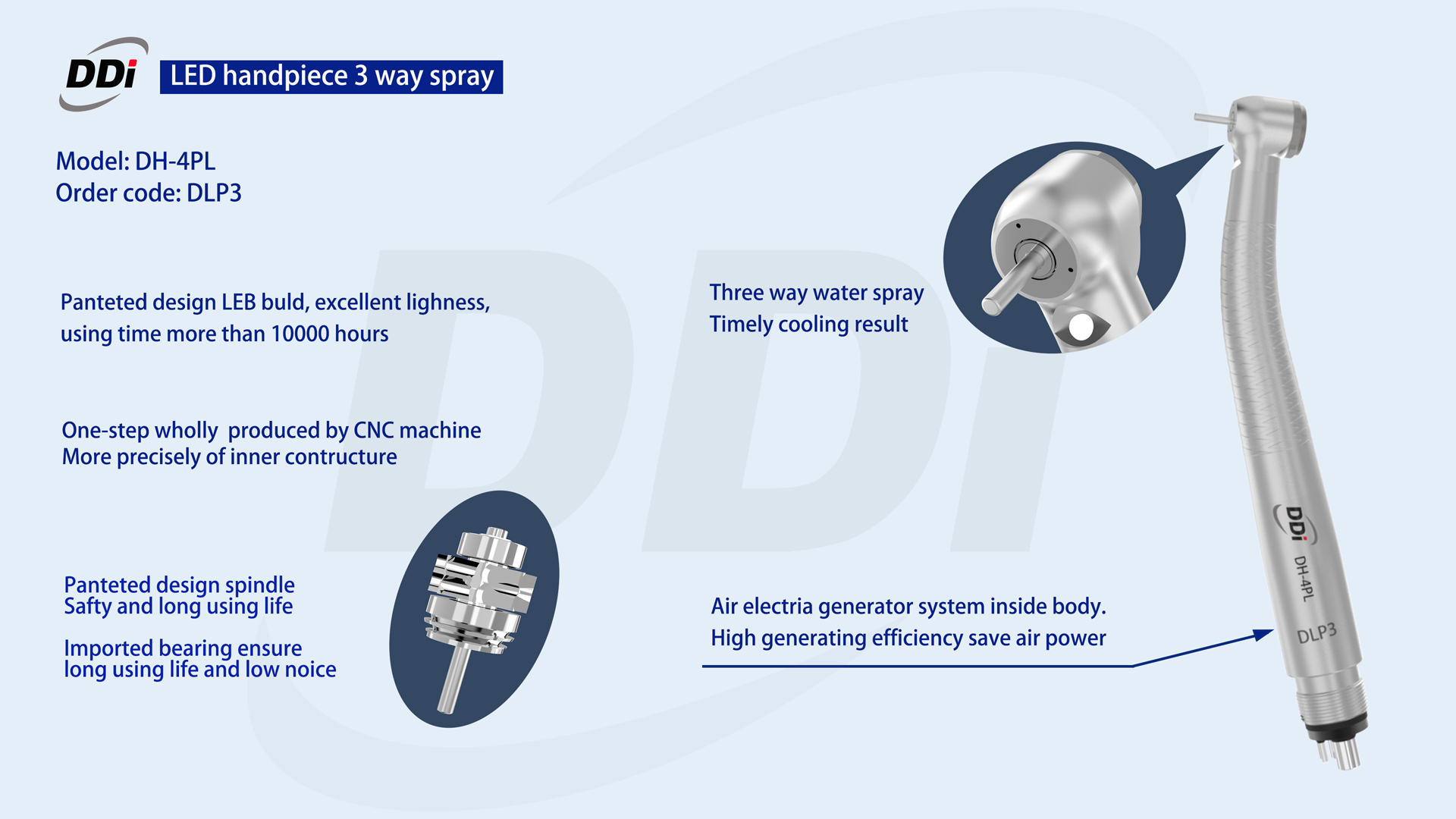 DDi Led High speed handpiece 3 way spray, compliant with CE and FDA standard, all material excellent biocompatibility.